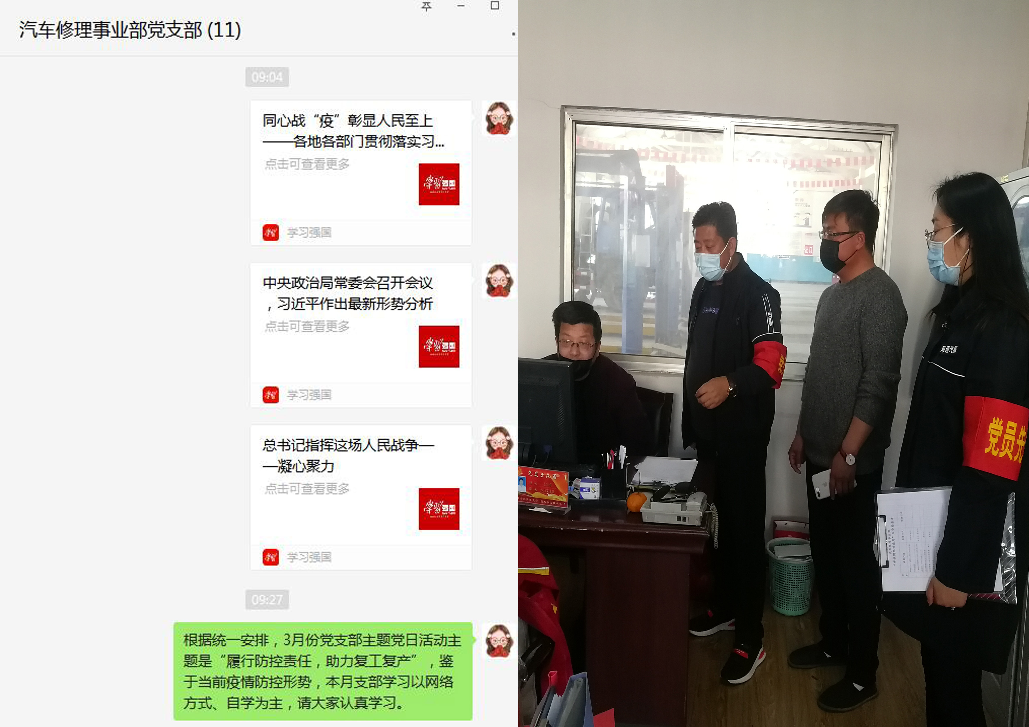 為充分引導(dǎo)廣大黨員沖鋒在前,爭當(dāng)疫情防控和復(fù)工復(fù)產(chǎn)的宣傳員、服務(wù)員、戰(zhàn)斗員,讓黨旗飄在一線、堡壘筑在一線、黨員沖在一線,3月19日,汽車修理事業(yè)部黨支部開展“履行防控責(zé)任,助力復(fù)工復(fù)產(chǎn)”主題黨日線上活動。