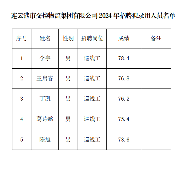 根據(jù)連云港市交控物流集團(tuán)有限公司2024年招聘簡章有關(guān)規(guī)定和要求,現(xiàn)將本次招聘擬錄用人員名單予以公示。