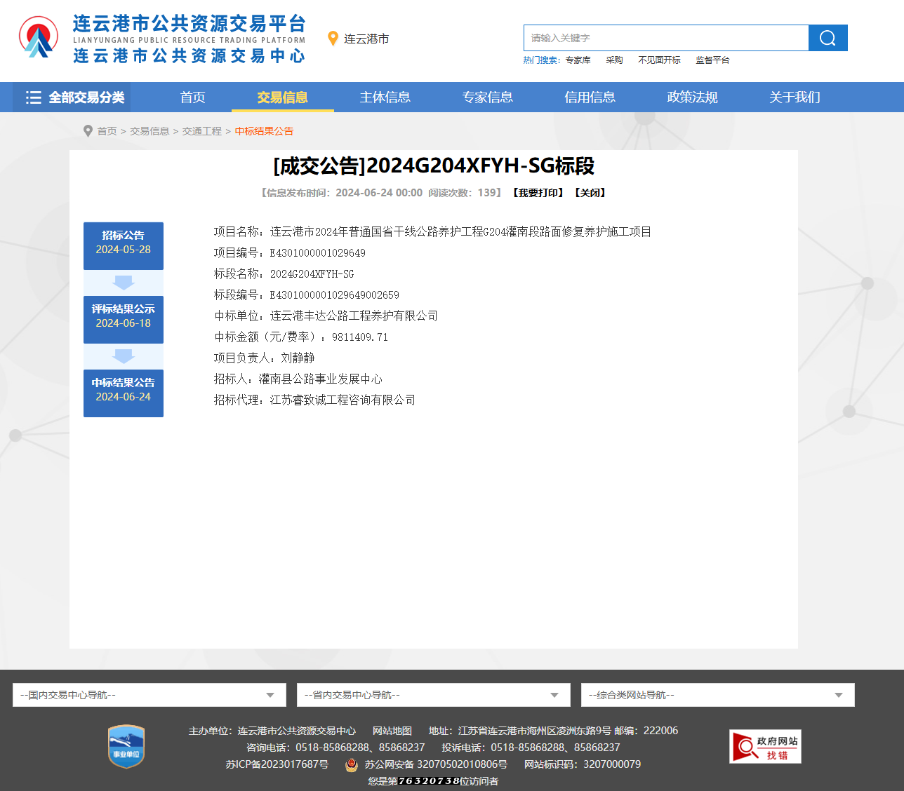 6月24日,豐達(dá)公司成功中標(biāo)連云港市2024年普通國省干線公路養(yǎng)護(hù)工程G204灌南段路面修復(fù)養(yǎng)護(hù)施工項目,中標(biāo)金額9811409.71元,工期6個月。