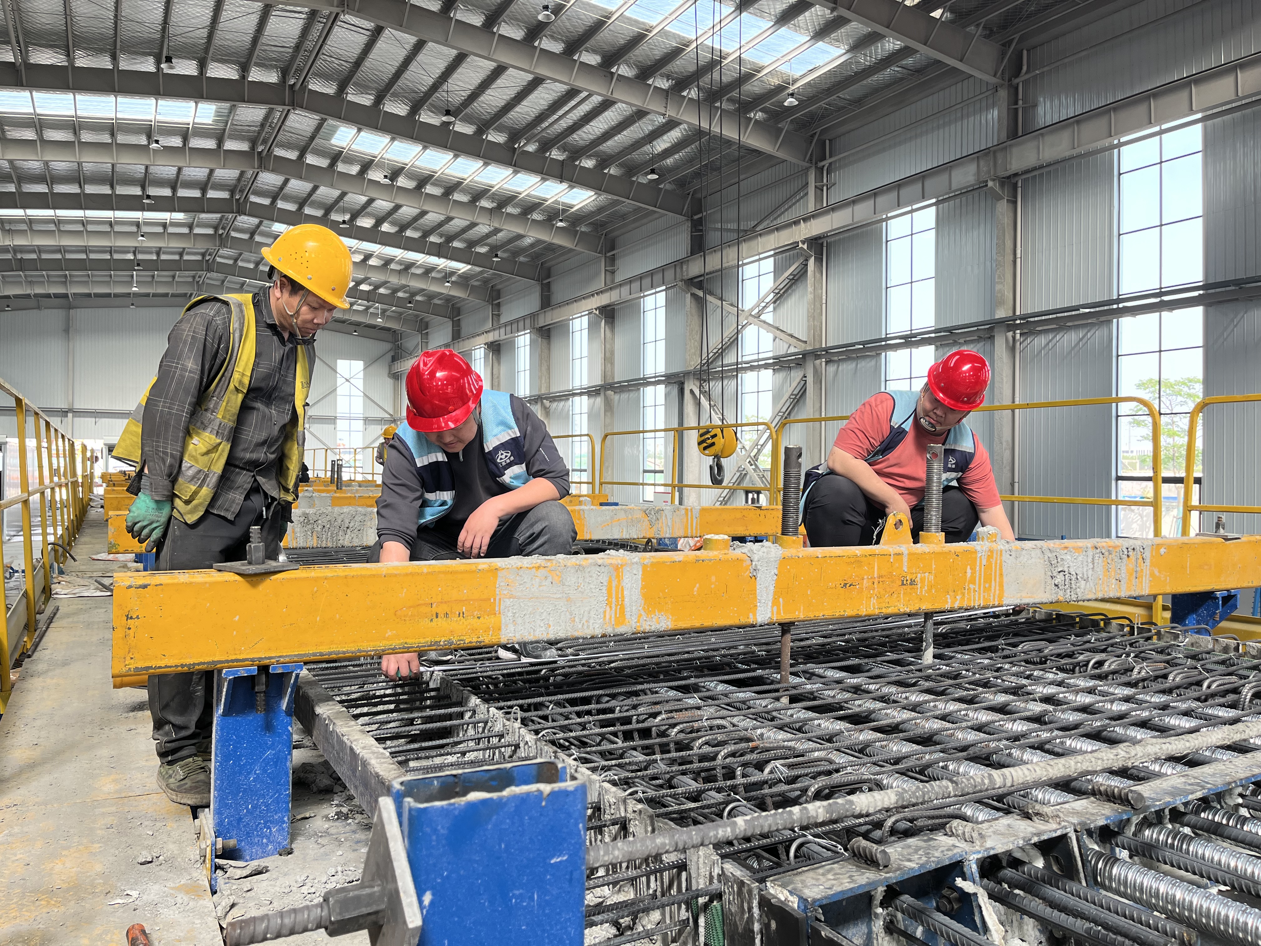 預(yù)制梁廠車間:精密制造,澆筑橋梁“脊梁”。與此同時(shí),通仁分公司預(yù)制梁廠內(nèi)同樣是一派繁忙景象。鋼筋加工區(qū)火花四濺,數(shù)控設(shè)備精準(zhǔn)切割、彎折鋼筋;澆筑區(qū)里,混凝土泵車與布料機(jī)默契配合,將混凝土精準(zhǔn)注入模具;養(yǎng)護(hù)區(qū)內(nèi),噴淋系統(tǒng)定時(shí)運(yùn)作,為預(yù)制梁提供最佳養(yǎng)護(hù)環(huán)境。預(yù)制廠事業(yè)部副經(jīng)理王道義對(duì)生產(chǎn)的鋼筋骨架間距、梁體內(nèi)部結(jié)構(gòu)、梁上斷面尺寸進(jìn)行仔細(xì)排查,他們說:“每片梁都是橋梁的‘脊梁’,必須確保零缺陷?!?/span>