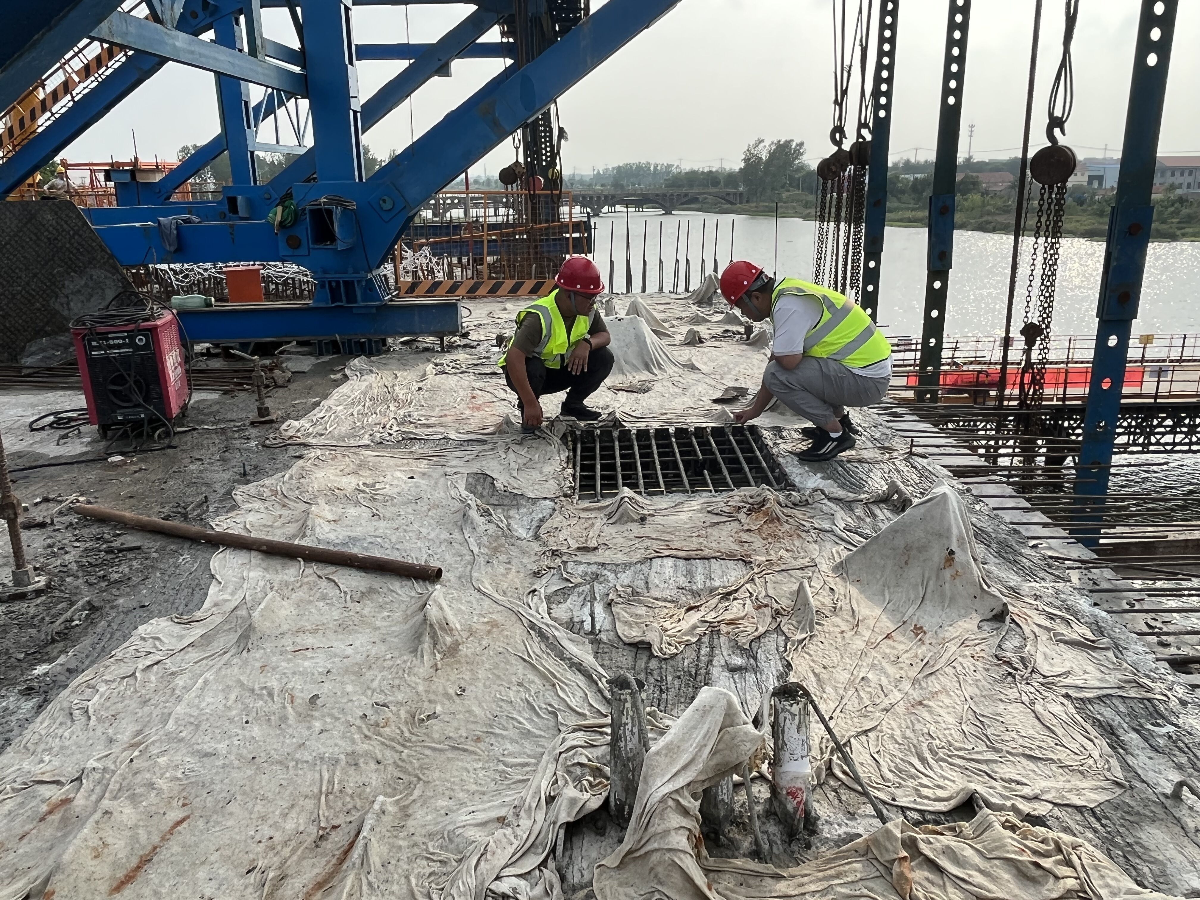 在S402贛榆南環(huán)段(G228-G204)路基橋涵工程沭北運河大橋施工現(xiàn)場,工人們正在進行上部結(jié)構(gòu)預(yù)應(yīng)力混凝土連續(xù)箱梁施工。澆筑混凝土前,施工人員對所用設(shè)備、機具進行嚴(yán)格調(diào)式,充分組織準(zhǔn)備;澆筑過程中,從鋼筋定位綁扎、預(yù)應(yīng)力管道定位、模板打磨安裝固定到混凝土澆筑,每一道工序均由現(xiàn)場管理人員進行旁站監(jiān)督,嚴(yán)格按照圖紙及規(guī)范要求施工,工序轉(zhuǎn)換前嚴(yán)格執(zhí)行“三檢制”,確保工序合格。經(jīng)過作業(yè)人員6個小時認(rèn)真合理布料、振搗換來了第五聯(lián)第三跨的成功澆筑。