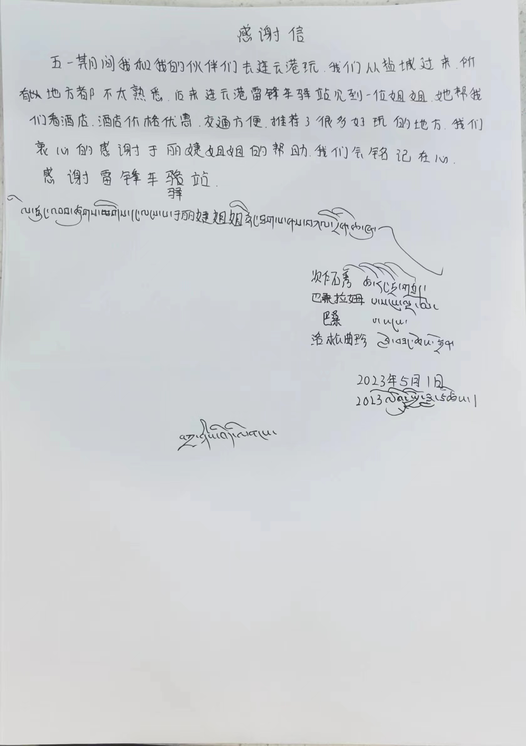 5月1日,連汽“雷鋒車”驛站收到了一封手寫的感謝信。寫感謝信的是四位外地來連游玩的大學(xué)生,她們在信中對(duì)“雷鋒車”驛站的志愿者于麗捷熱情、友愛、助人的工作作風(fēng)深表謝意。感激之余,四位大學(xué)生寫下了這樣一封感謝信。