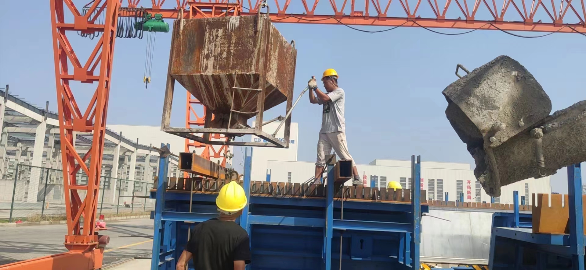 6月24日上午,在江蘇海建402省道贛榆南環(huán)段路基橋涵工程現(xiàn)場(chǎng),經(jīng)過緊張忙碌,順利完成首件橋梁工程預(yù)制箱梁澆筑工作。402省道贛榆南環(huán)段路基橋涵工程沭北運(yùn)河大橋橋梁全長(zhǎng)500m,預(yù)制箱梁12跨共96榀。本次首件澆筑的目在于通過首件確定混凝土最佳配合比,驗(yàn)證原材料強(qiáng)度、穩(wěn)定性試驗(yàn)是否可行,從而對(duì)混凝土強(qiáng)度及穩(wěn)定性進(jìn)行控制,同時(shí)通過箱梁首件澆筑對(duì)鋼筋保護(hù)層厚度進(jìn)行驗(yàn)證,保證后期箱梁大面積施工中鋼筋保護(hù)層厚度合格率。